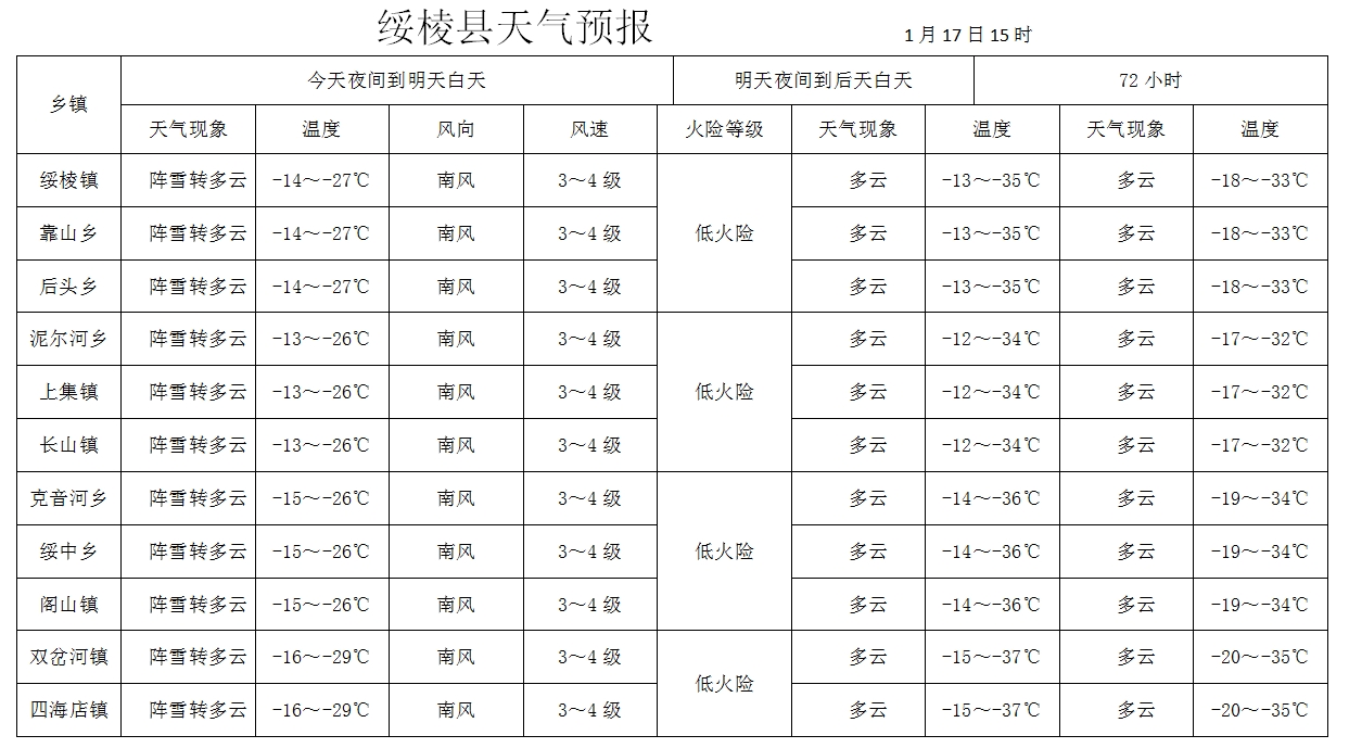 绥棱县各乡镇72小时天气预报(1月17日)